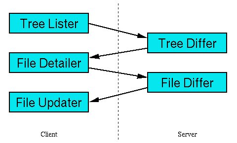 The Tree Lister sends a list of the client's files to the server, along with relevant information such as their modification times. At the same time, the Tree Differ generates a list of the server's files. As the client's list arrives from the Tree Lister, the Tree Differ compares it against its own list to determine which files need to be updated. Because both lists are generated in a particular order (alphabetical order, with a wrinkle or two), the Tree Differ can determine immediately as each file comes up in the list whether it is missing, extra, out of date, or up to date on the client--before the rest of the list has even been generated. The first three cases represent differences, i.e., things that need to be changed on the client. Each difference causes the Tree Differ to send a command to the client via the second communication channel in the diagram: